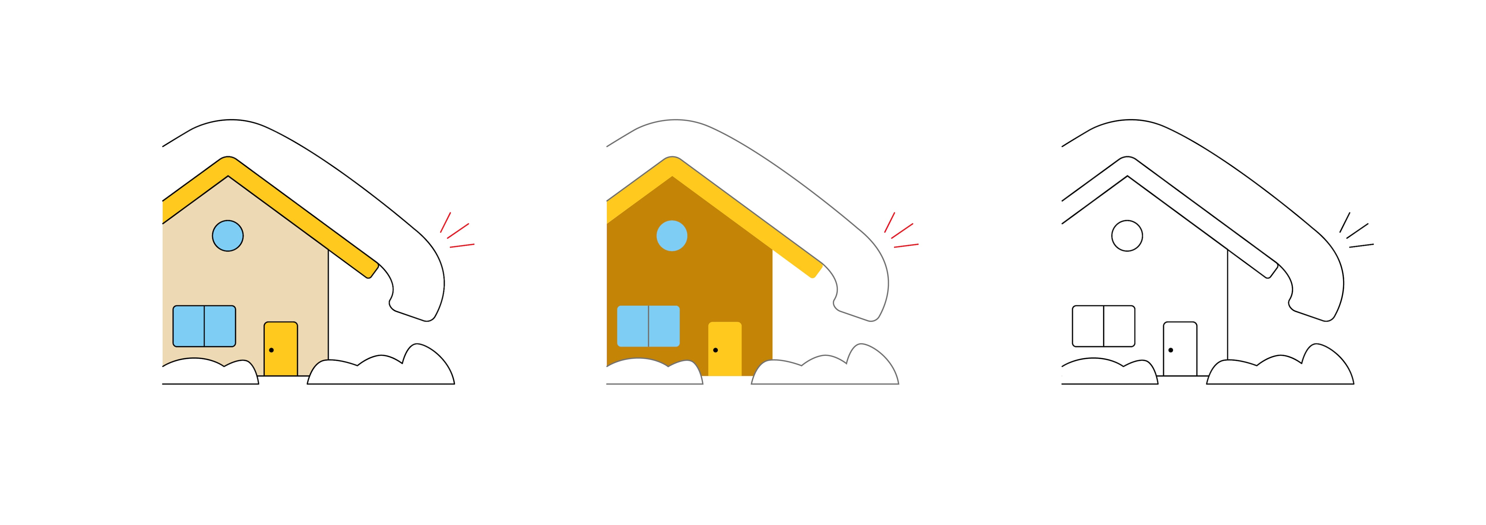 屋根に積もった雪が大きくせり出した「雪庇(せっぴ)」と、落雪の危険性を表現したイラストセットです。カラーバリエーションとシンプルな線画の3種類を収録しています。冬の事故防止、雪下ろしや除雪の注意喚起、寒冷地における住宅管理の広告やWebサイトのバナー素材として最適です。フラットデザインのアイコン風に仕上げているため、自治体の広報誌や不動産管理のチラシなど、幅広い媒体で視覚的に分かりやすく情報を伝えられます。 #雪庇 #落雪 #注意 #屋根 #雪