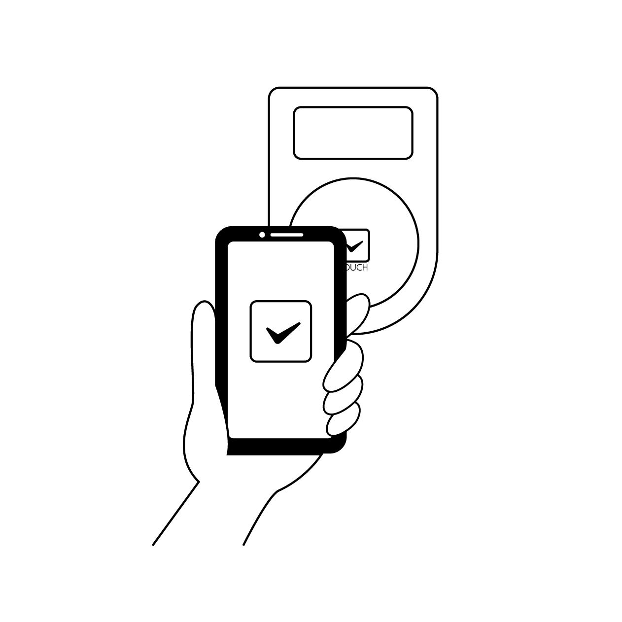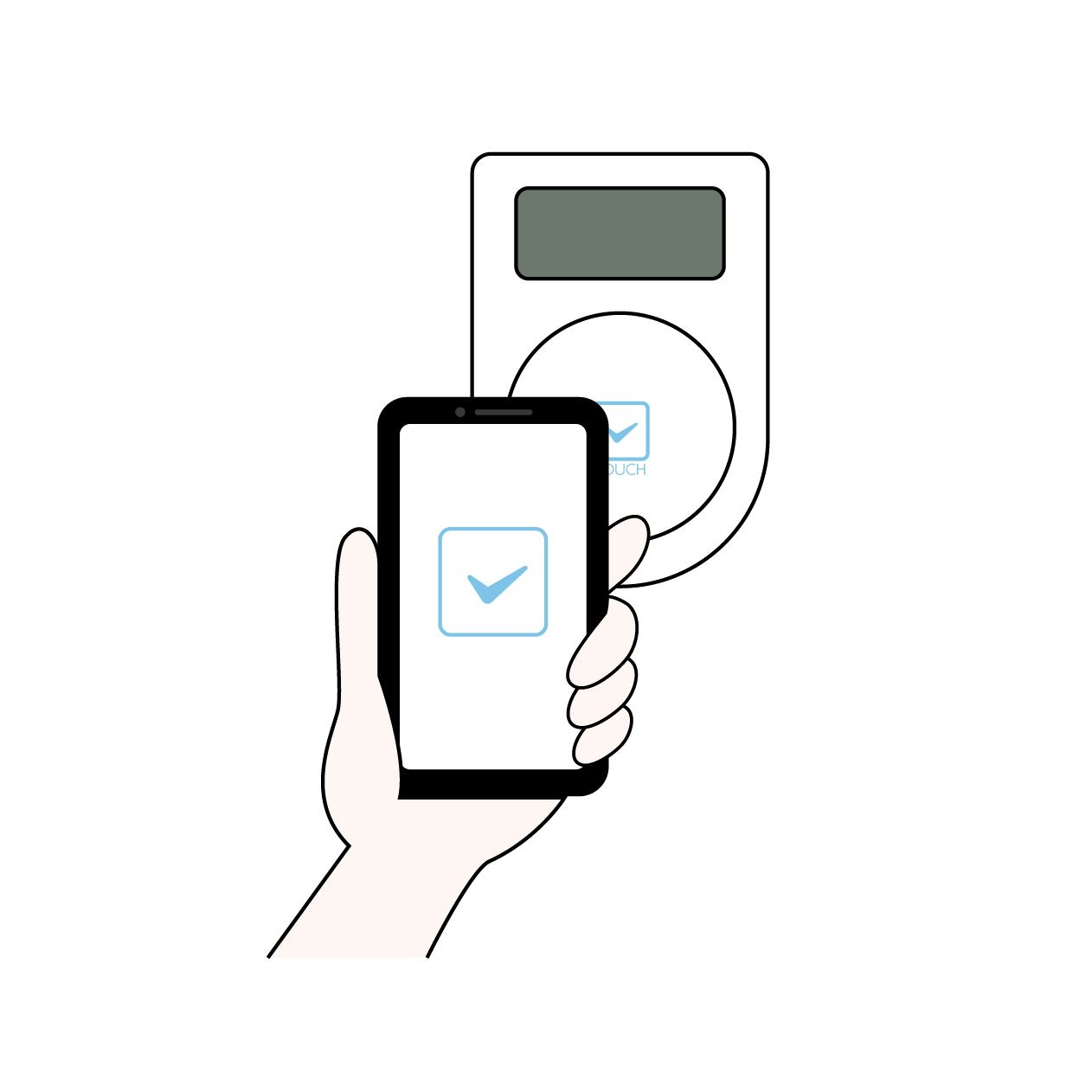 スマートフォンをICカードリーダーにかざして非接触決済を行うシーンを描いたイラスト素材です。スマホ決済やモバイルウォレット、電子マネーによるスマートな支払いをイメージしています。店舗のレジでの会計、駅の改札、スマホを鍵とした入退室管理などの解説図やWebサイト、広告デザインに最適です。ICカードリーダー、あいしーかーどりーだー、IC Card Reader、スマホ決済の各表記で検索性を高めています。