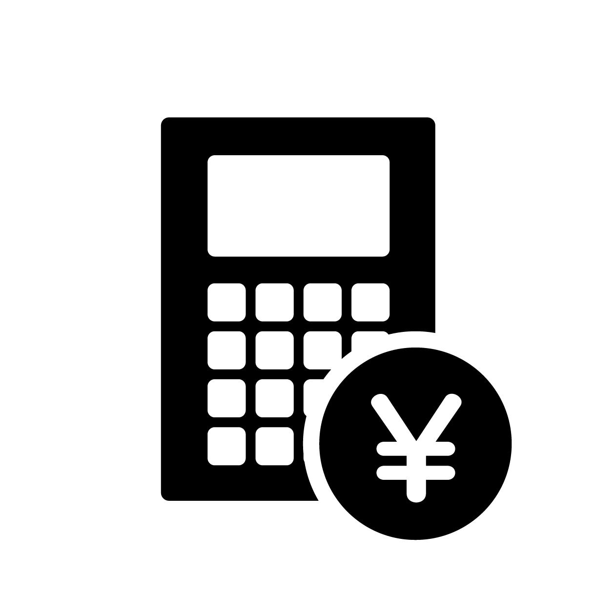 電卓(計算機)と日本円の通貨記号(¥)が描かれたコインを組み合わせた、シンプルで視認性の高いアイコン素材です。家計簿の管理、節約、見積もり作成、会計業務、確定申告など、お金にまつわる幅広いシーンのWebサイトや広告、アプリのデザインに適しています。