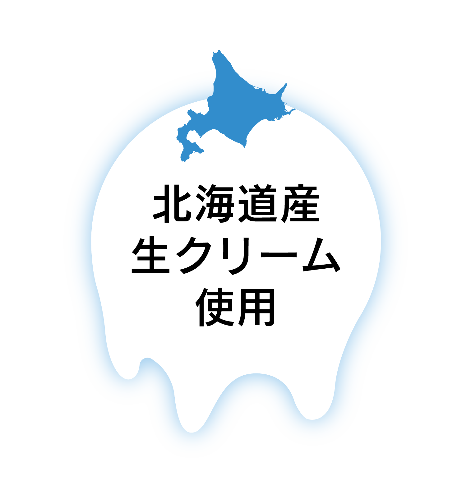 北海道産の生クリームを使用していることを視覚的に伝えるロゴデザイン素材です。上部には北海道の地形シルエットを配し、全体を滴る生クリームの形状で構成しています。中央には「北海道産生クリーム使用」の文字を配置し、一目で商品のこだわりが伝わるデザインです。スイーツのパッケージ、カフェのメニュー、WEBサイトのバナー広告、店頭POPなど、乳製品の品質をアピールしたい場面に最適です。