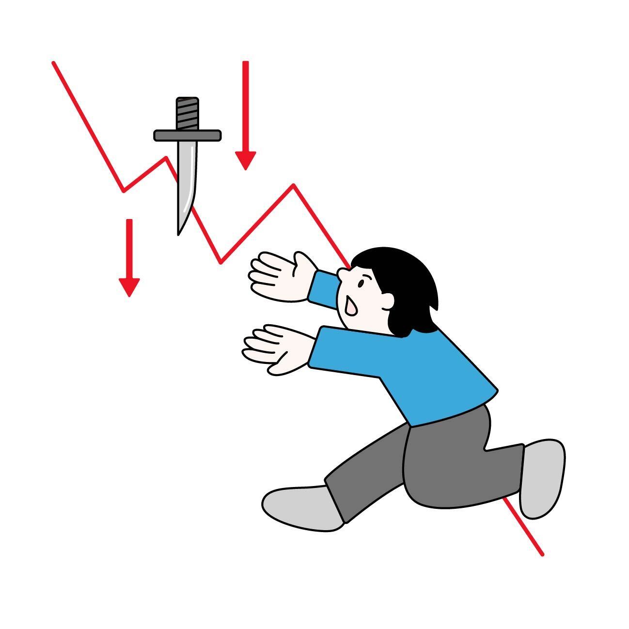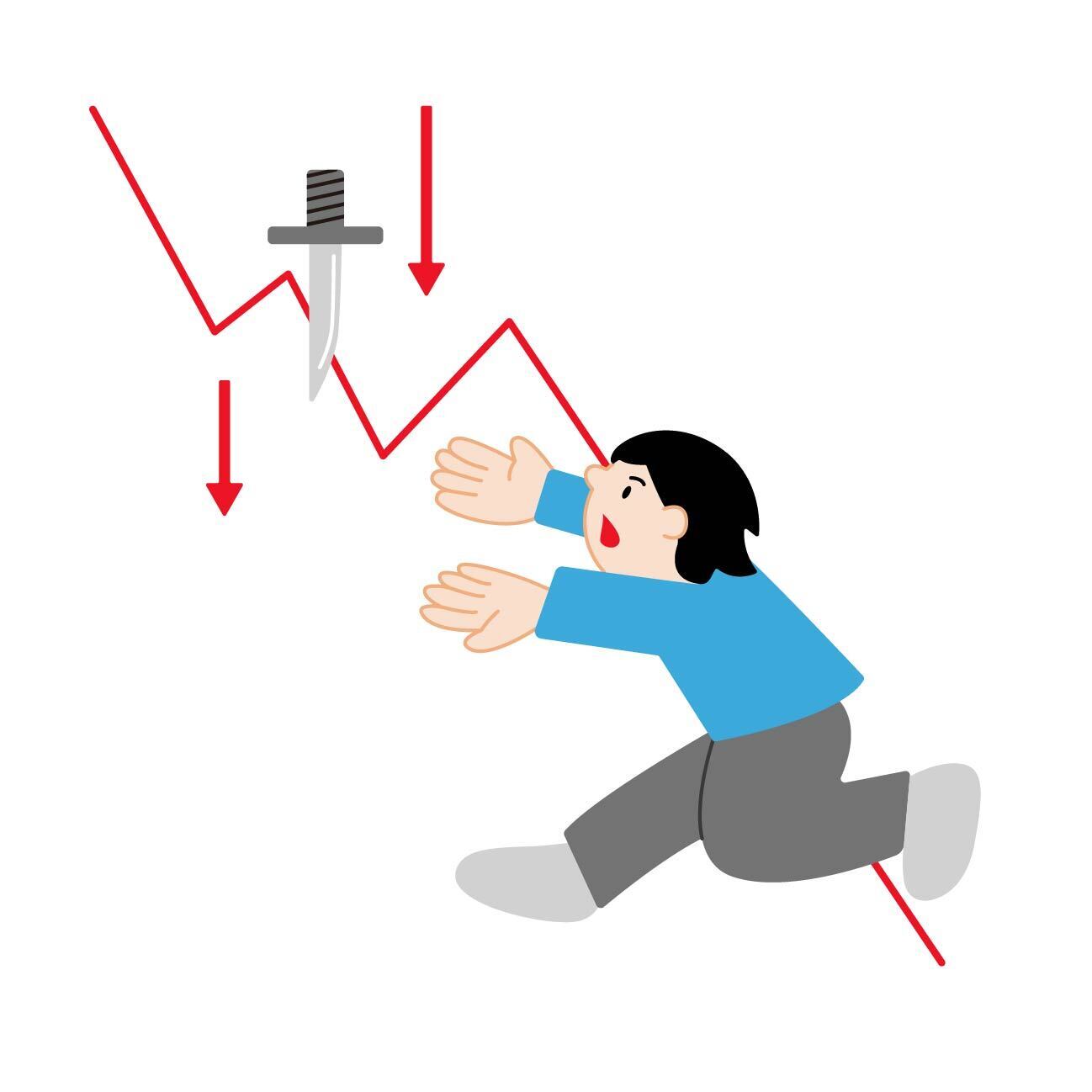 暴落するチャートと落ちてくるナイフを掴もうとする投資家